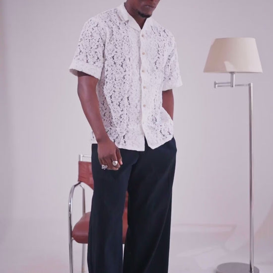 The outfit features a pair of black wide-leg trousers with a relaxed fit, adding a refined yet casual touch to the look. The trousers have a straight cut with a slight drape, enhancing the effortless aesthetic.