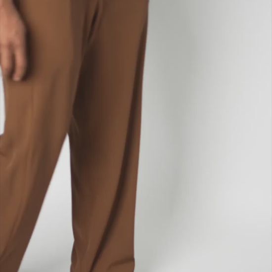 Refined, relaxed, and ready for anything — the Clay Drape Crepe Trousers blend modern ease with elevated texture. Crafted from a smooth, lightweight crepe fabric in a warm clay brown tone, these trousers feature a fluid straight-leg silhouette that moves with you. The soft drape and matte finish offer a sophisticated alternative to traditional loungewear, making them perfect for both casual and dressed-up looks. Finished with side pockets and a clean waistband, this is minimalist tailoring at its most versatile. Ideal for pairing with elevated basics or structured layers.