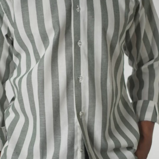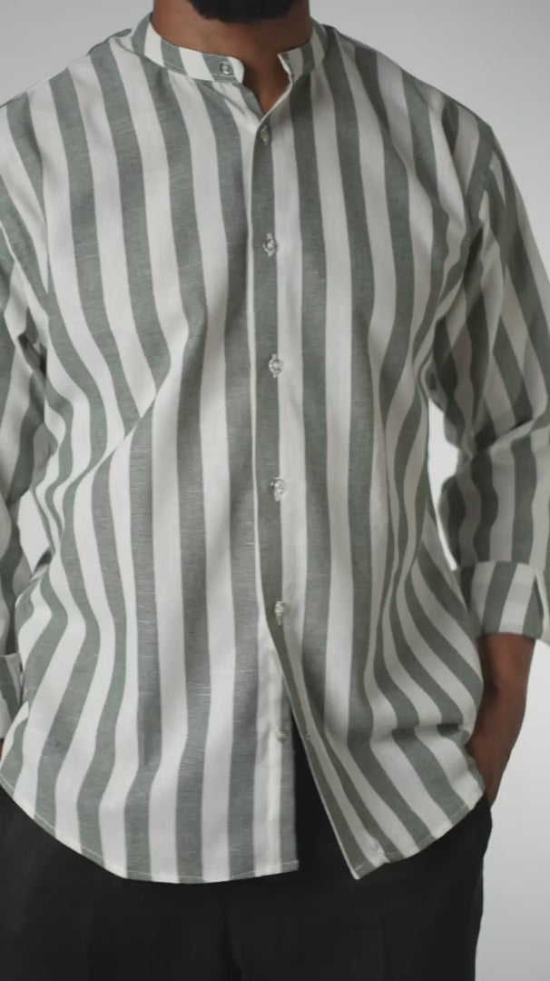 The Sage Stripe Band Collar Shirt is a fresh take on classic shirting, blending soft structure with effortless style. Made from a breathable cotton-linen blend, it features bold vertical sage green and white stripes that elongate the silhouette and add a touch of refined character. The band collar and hidden placket offer a clean, modern edge, while the relaxed fit makes it perfect for both casual and elevated wear. Roll up the sleeves for a laid-back look, or button it up for a more polished feel — this shirt transitions seamlessly from day to night.
