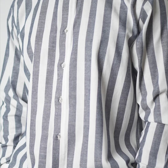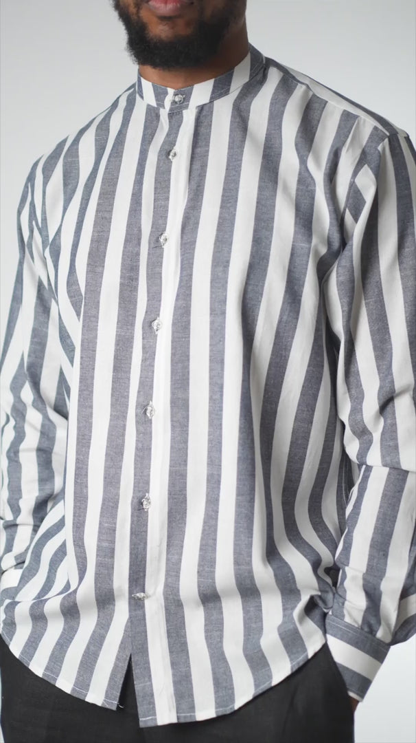 The Slate Stripe Band Collar Shirt brings a fresh, modern edge to a timeless silhouette. Made from a breathable cotton-linen blend, it features bold vertical stripes in slate grey and white for a clean, confident look. The band collar adds a refined touch, while the relaxed fit keeps it comfortable and easy to wear. Finished with a button-down front and curved hem, this shirt transitions effortlessly from casual to elevated. Pair it with tailored trousers or light denim for a versatile outfit that stands out without trying too hard.