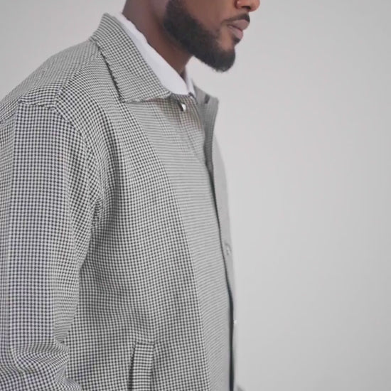 The houndstooth-patterned, button-up Harrington-style jacket in a monochrome black-and-white color scheme. It features a classic pointed collar, a straight hem with an adjustable button tab, and side pockets for a functional yet polished look. The fabric appears to be mid-weight, making it suitable for transitional weather.